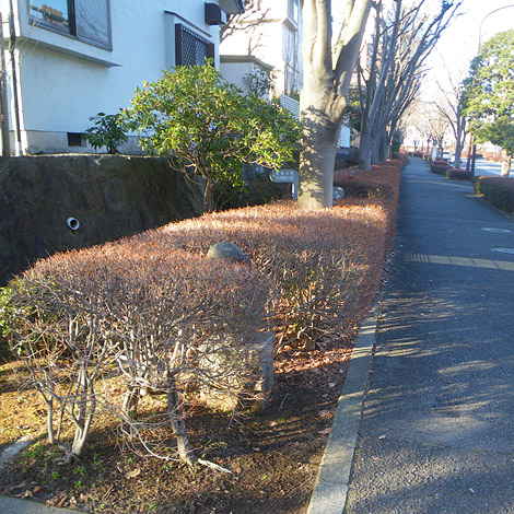 垣根に埋もれつつも、少し後に反りながら上を眺めている姿が愛らしいです。 - 地元民のウラ情報ここは森の里の外周道路でもありますし、道沿いに病院やスーパーがあるので、結構人通りがあります。