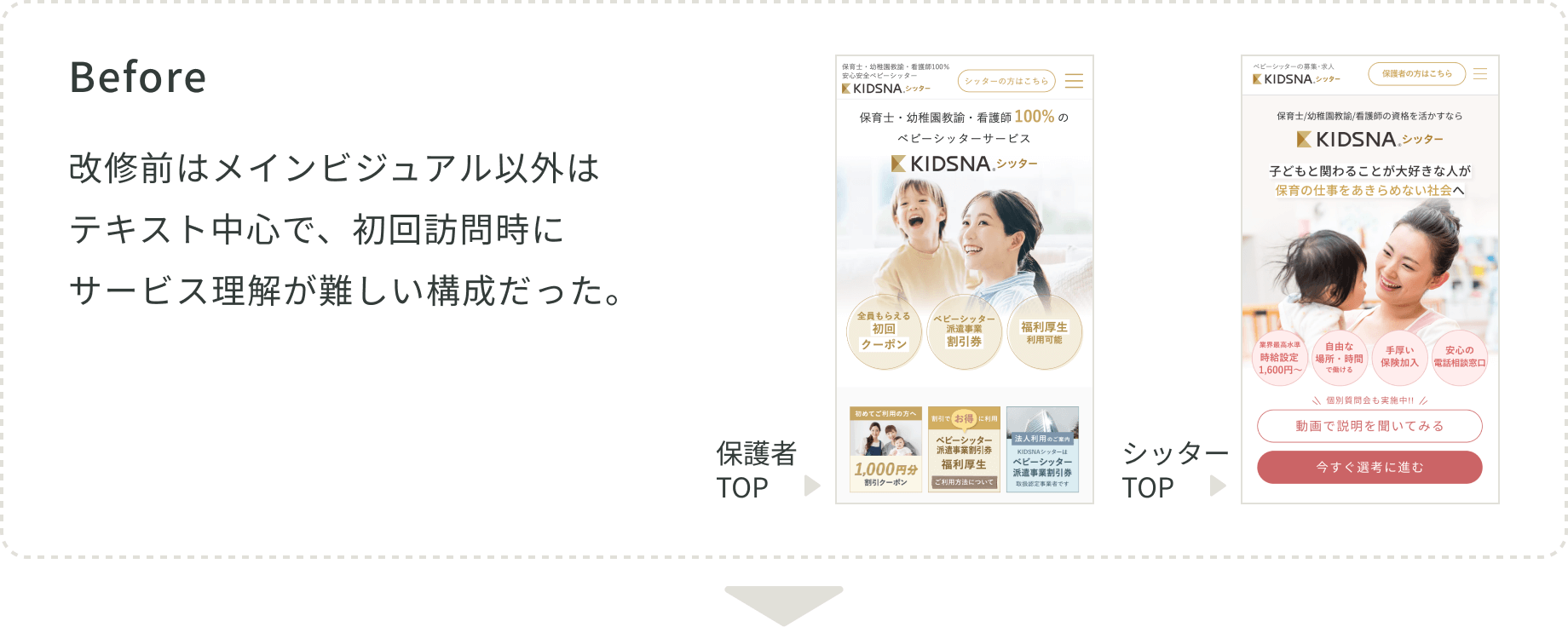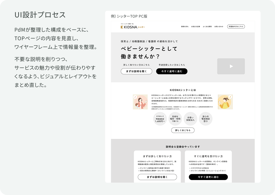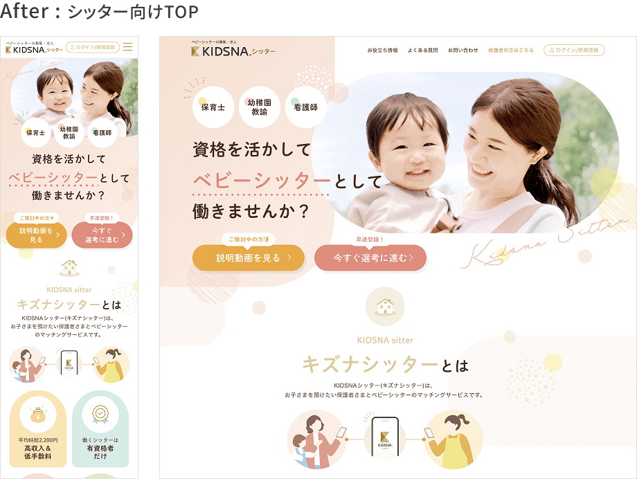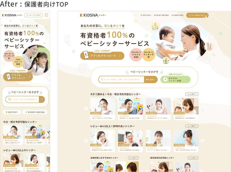 既存WEBサイトは情報量の増加により、未利用ユーザーにとってサービス内容や利用イメージが把握しづらい状態となっていた。本リニューアルでは、先行して整理したアプリUIを基盤に、保護者向け/シッター向けそれぞれの視点がファーストビューで明確に伝わる構成へ再設計。安心感・信頼感を軸に情報設計とビジュアルを再構成し、ユーザーの理解負荷を下げながら、自然に次の行動につながる導線へ改善した。