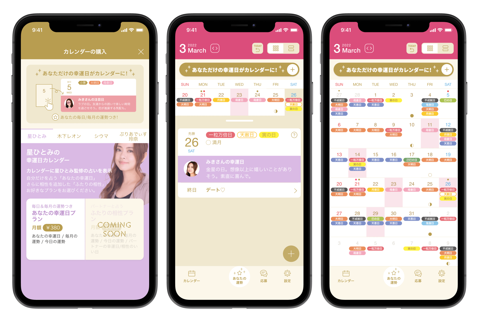 性格・相性診断などの新要素を加え、日常の中で占いを楽しく活用できるカレンダーアプリをデザイン。